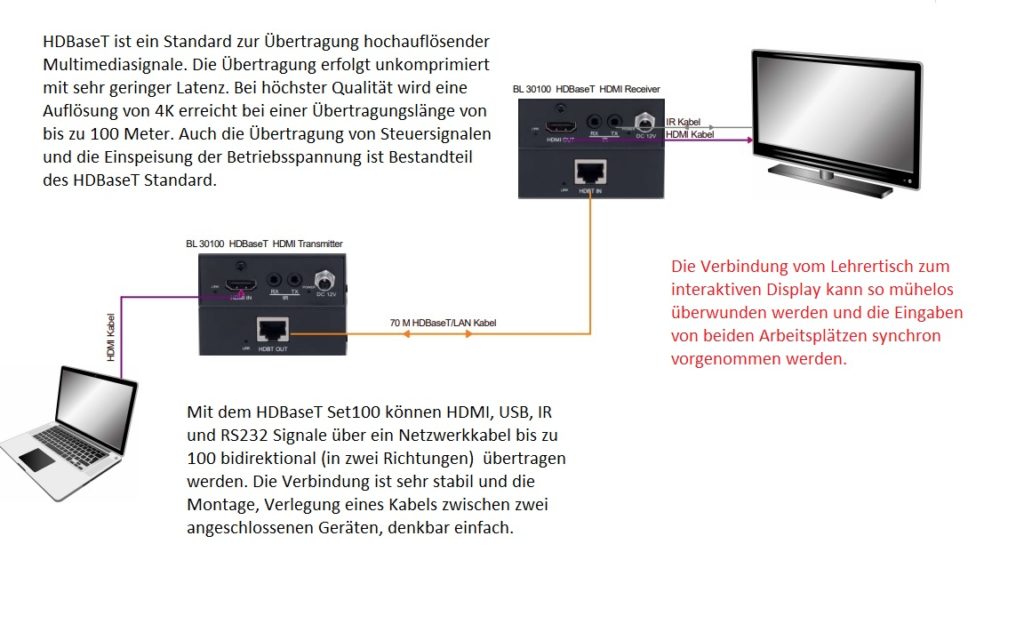 Alle elektronischen Geräte brauchen neben der Stromzufuhr Kabel, die die Signale von einem zum anderem Gerät übertragen. Die Signalübertragung per WLAN oder Funk funktioniert manchmal aber nicht immer zuverlässig. Um störunanfällige Systeme im Klassenraum zu etablieren und Kabelverbindungen auf das maximal mögliche zu reduzieren, bieten sich sogenannte Extender an, die unauffällig hinter den Tafelsystemen und in Schreibtischen oder Podien eingebaut werden können.