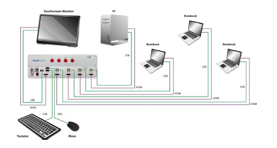 Das System Quick-Touch ist ein Hardware basierter HDMI/USB-Umschalter und eignet sich besonders für Verschaltung von bis zu 4 Computern an einem Touch-Panel. Durch einen einfachen Tastendruck wird der Content eines gewünschten Computers auf ein angeschlossenes Panel geschaltet, von dem die Präsentation fortgeführt werden kann. Dieses Gerät eignet sich als Anschlusskomponente für Räume in denen z.B. viel Gruppenarbeiten mit SOL und Ergebnispräsentationen durchgeführt werden soll.